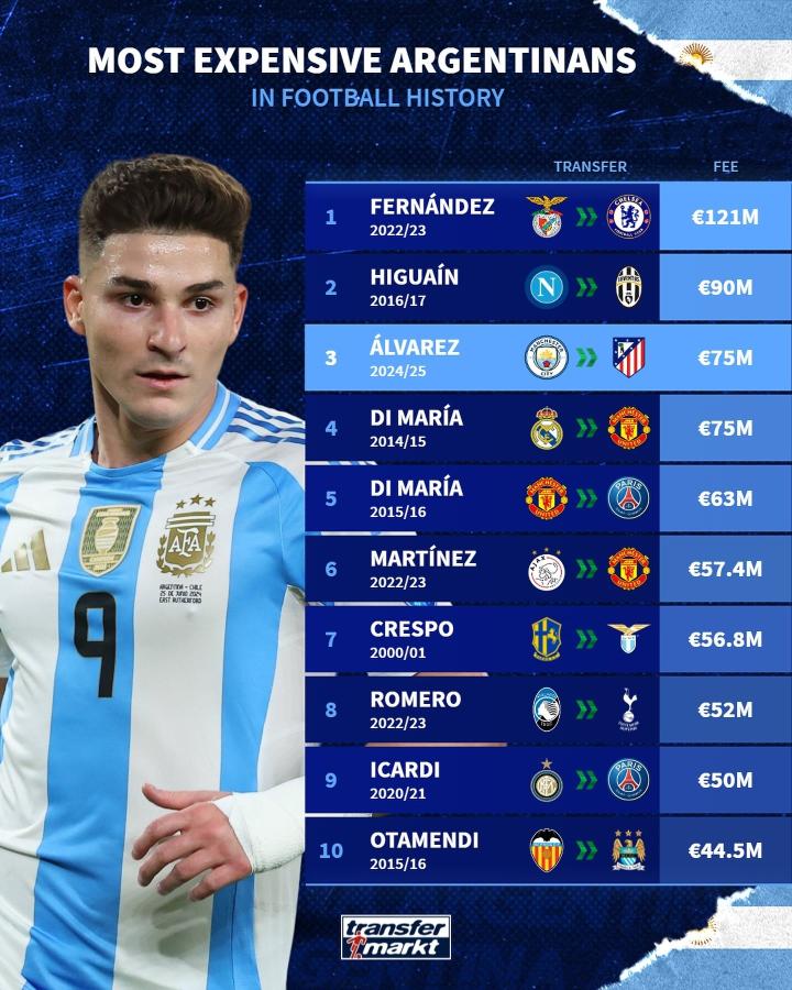 阿根廷前锋阿尔瓦雷斯从曼城转会加盟马德里竞技,据悉转会费为7500万欧固定。据统计,阿尔瓦雷斯是单次转会费第三高的阿根廷球员,仅次于恩佐和伊瓜因。