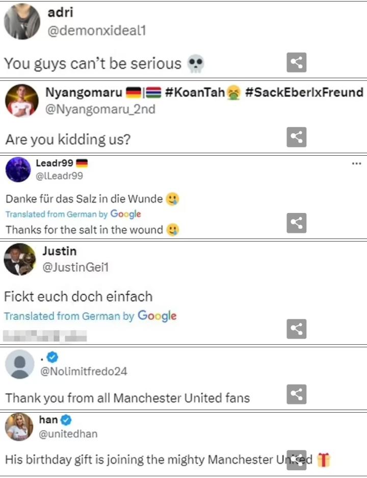 另一位支持者用德语评论:“谢谢你们在伤口上撒盐。”而其他一些球迷则更加直接,写道:“去你X的。”