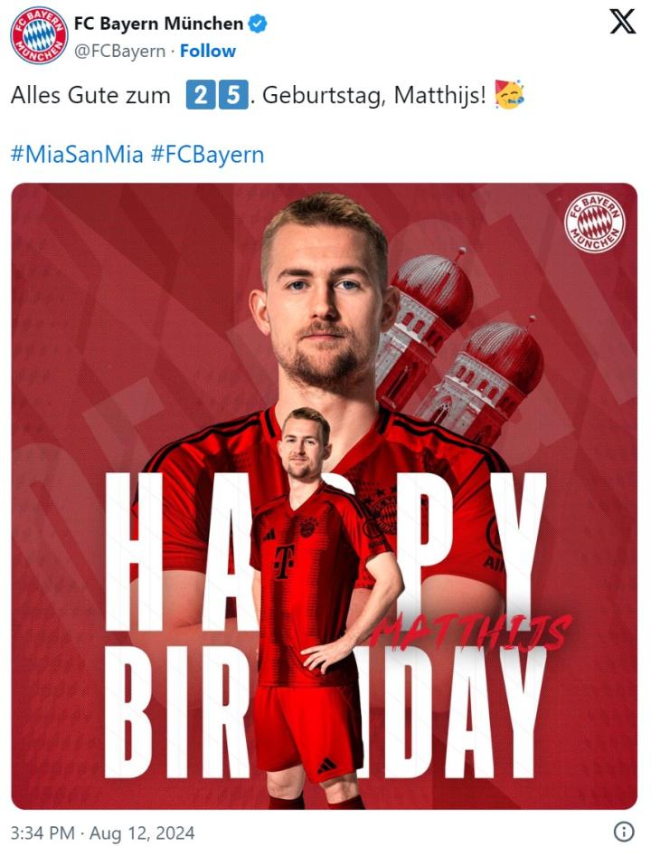 这位荷兰中后卫今天满25岁,他的现任俱乐部在社交平台上发文祝他生日快乐。然而,一些球迷并不欣赏拜仁的这份心意,因为德利赫特在周末已经同意转会到曼联,他将在那里与前教练滕哈格重聚。