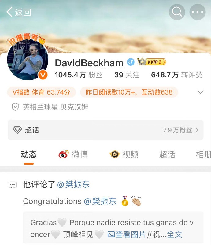 梦幻联动,贝克汉姆社媒关注樊振东,并祝贺后者巴黎夺金凡尔赛小木屋 @懂球帝2024-08-13 11:54巴黎奥运会落下帷幕,樊振东夺得男单金牌实现大满贯,并搭档队友获得男团金牌。在樊振东夺金后,皇马官方社媒发文祝贺道:“祝贺樊振东夺得2024巴黎奥运会乒乓球男单冠军,并达成大满贯成就,我们为这位美凌格所展示出的拼搏精神感到骄傲,恭喜! ”贝克汉姆的社媒转发了这条动态并祝贺樊振东,同时也关注了樊振东的社媒账号。展开更多