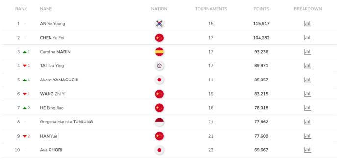 国际羽联第32期和第33期世界排名对比显示,女单世界排名前十的球员中,只有何冰娇没有再次出现。