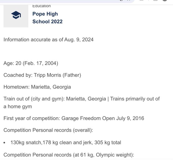 出生于2004年的莫里斯现年20岁,来自美国佐治亚州。他在幼年时观看一场线下举重比赛后爱上了举重运动,从小就跟随父亲训练。莫里斯是2021以及2022年举重青年世界冠军,他在今年4月的IWF举重世界杯上获得了61公斤级银牌,并且以176公斤(约 388 磅)的挺举成绩打破了李发彬此前保持的挺举世界纪录 ,震惊了世界,这是美国选手自1969年以来首次在高级别比赛中打破世界纪录。