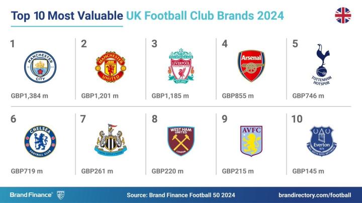 2024年英超俱乐部品牌价值前10: