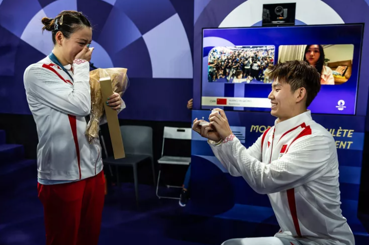 或许是受到刘雨辰的启发,奥运会上求婚成为了一种时尚。女子3000米障碍赛结束后,拿到第四名的法国选手爱丽丝-菲诺特直接跑到看台下,然后单膝跪地向西班牙男友求婚,对方眼含热泪不住点头。