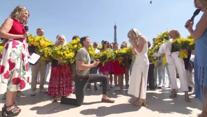 奥运会男子四人赛艇金牌的美国运动员贾斯汀-贝斯特,在拿到冠军后,特意在埃菲尔铁塔下准备了2738朵黄玫瑰,代表和女友莱尼认识2738天,最终他求婚成功,有情人终成眷属。