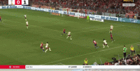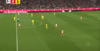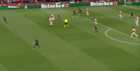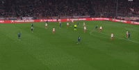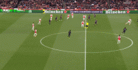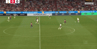 这两点叠加在一起,使得德里赫特能够覆盖到的空间相当之大,比如这一球里,边路还有队友在追,大部分中卫就会退到禁区内等着解围,但德里赫特没有这样行事,他依然选择外扩防守,从而影响到了对手传中后的皮球运行轨迹: