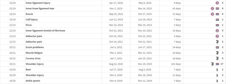 除了队内竞争之外,过去五年,德里赫特的身体也不够稳定,受伤的次数虽然不多,但来到拜仁之后,他的膝盖内侧副韧带开始受到波及: