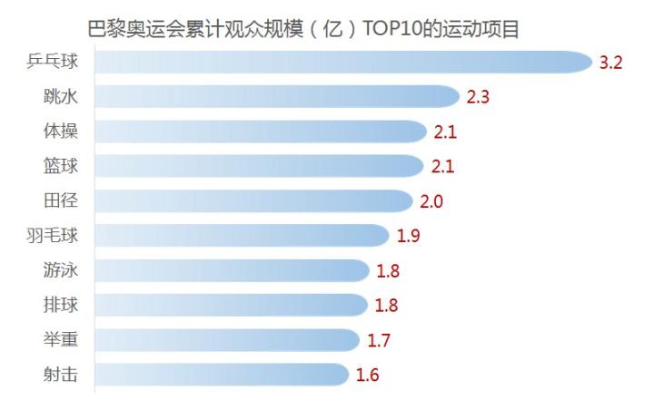 巴黎奥运会期间,国球乒乓球再次成为国民关注焦点,收获3.2亿观众,中国代表团优势项目跳水和体操累计观众规模分别达2.3亿、2.1亿;篮球和田径的累计观众规模也超2亿人。
