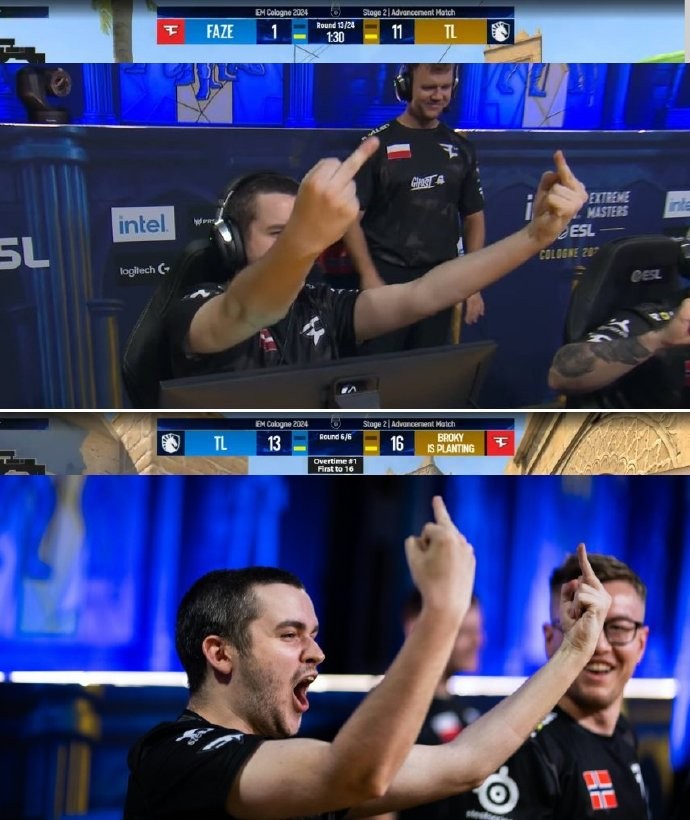 来到戏剧性拉满的决胜图,FaZe完美诠释什么叫做“1分够了”。银河战舰上半场1-11落后,下半场3-12送出9个赛点,此后打出铁血防守回敬11-1拖入加时,最终16-13逆转取胜双杀液体,搭上前往主舞台的末班车。FaZe此役年轻三人组发挥出色,broky更是在比赛中积极互动,数次向液体五人竖出中指,亲手送走总监的团队。