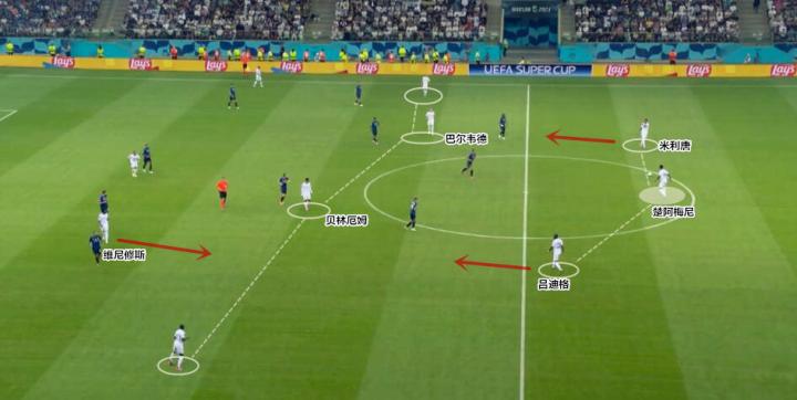 (图)从433到343,楚阿梅尼被藏了起来,皇马依靠四名带球能力很强的球员(边中卫+中前卫)完成推进任务。