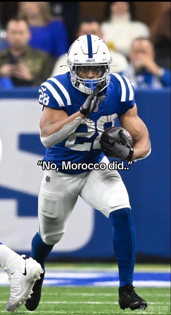 印第安纳小马队在社媒上发布了一个三张图片的图集,第一张图片是四分卫安东尼-理查德森,标题是 “莱斯特城拥有最伟大的逆袭故事......”显然是指莱斯特城在2015-16年英超联赛中夺冠。第二张图片是跑卫乔纳森-泰勒,标题为 “不,摩洛哥做到了”,似乎暗指摩洛哥队史诗般地闯入了2022年世界杯半决赛。