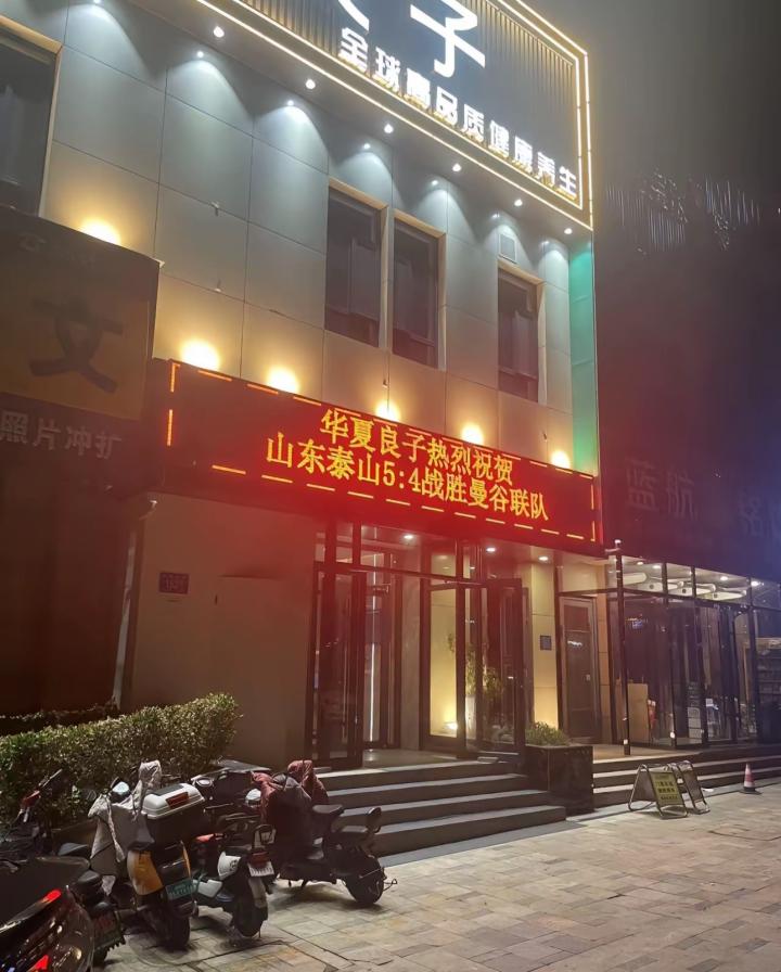从这位网友晒出的照片来看,这家华夏良子养生店的电子显示屏上写着:“华夏良子热烈祝贺山东泰山5-4战胜曼谷联队。”