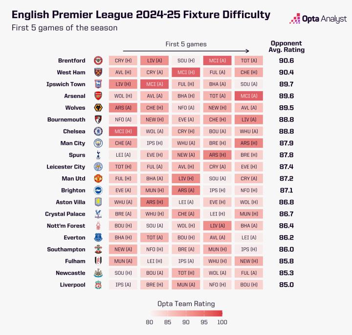 英超新赛季开局难易度对比:布伦特福德最难,利物浦最容易蓝司机学姐 @懂球帝2024-08-15 18:58知名数据统计机构OPTA,根据英超20支球队新赛季前5轮比赛的赛程,以及参考上赛季战绩得出的对手的强弱程度,统计出了英超球队的新赛季开局难易度指数。最难的是布伦特福德,他们需要前往客场挑战利物浦、曼城和热刺,难度指数达到了90.6分。难度排名前五的球队还有西汉姆联、伊普斯维奇、阿森纳和狼队。最简单是利物浦,难度指数仅有85分。展开更多