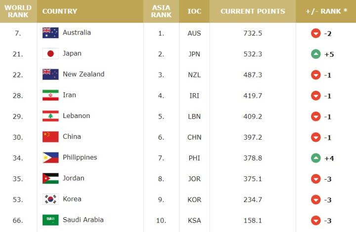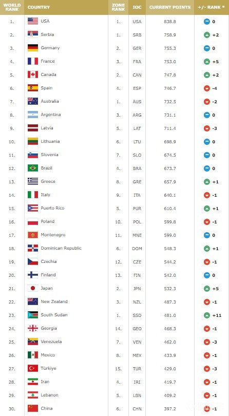 FIBA更新男篮世界排名:中国降一位排第30,日本升五位排第21海淀小冰2024-08-15 20:58北京时间8月15日,FIBA官网更新了奥运会后的男篮世界排名,中国男篮下降一位排名第30,日本男篮上升五位排名第21,南苏丹男篮上升十一位。美国男篮稳居榜首;塞尔维亚夺得奥运铜牌上升至第2;法国获得银牌升至第4;南苏丹男篮升十一位排名第23;日本男篮上升五位排名21;中国男篮下降一位排名第30,在亚洲赛区排名第6(落后于澳大利亚、日本、新西兰、伊朗、黎巴嫩)。展开更多