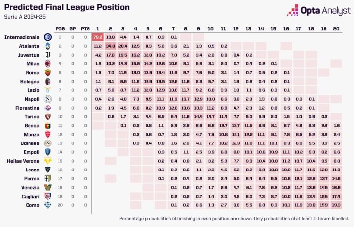 2024-25赛季意甲将于周末开打,知名数据机构Opta预测了夺冠概率,国米是头号热门,并且遥遥领先对手。