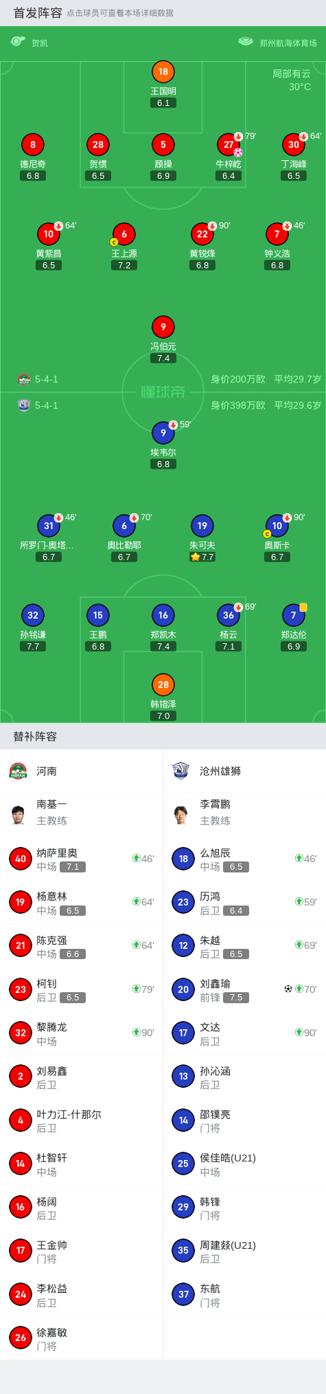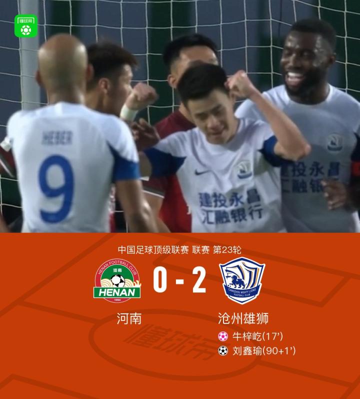 北京时间8月16日,中国足球顶级联赛第23轮,河南队主场迎战沧州雄狮队。上半场孙铭谦一条龙射门中框,球弹在牛梓屹身上造成乌龙。下半场补时阶段刘鑫瑜轰出世界波锁定胜局。最终,沧州2-0客胜河南迎联赛两连胜。
