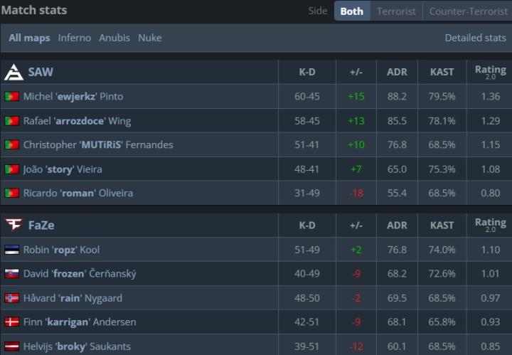 全葡班SAW延续黑马本色,他们与FaZe互爆选图后在决胜图胜出,打入赛事半决赛。在银河战舰的传统强图小镇中SAW打得游刃有余,在CT和T两方都压制了FaZe,图二阿努比斯最后一回合,FaZe依靠寒王的冷静双杀将比赛拖入决胜图。