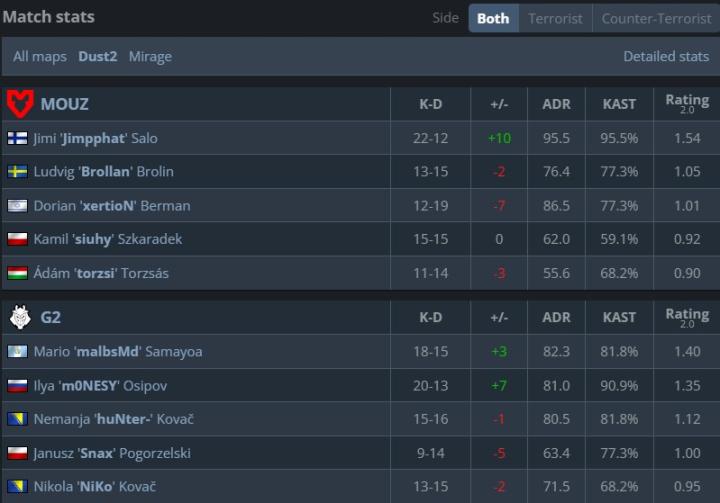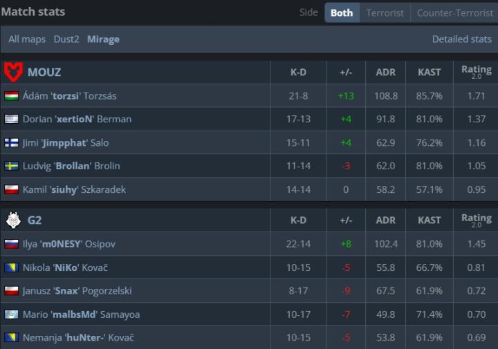 纵观两图数据,MOUZ的火力点更分散也更稳定,小吉米、拖哥、xertioN都能在地图中独当一面,反观G2,除m0NESY外四人都表现挣扎,偶有高光操作但无济于事。
