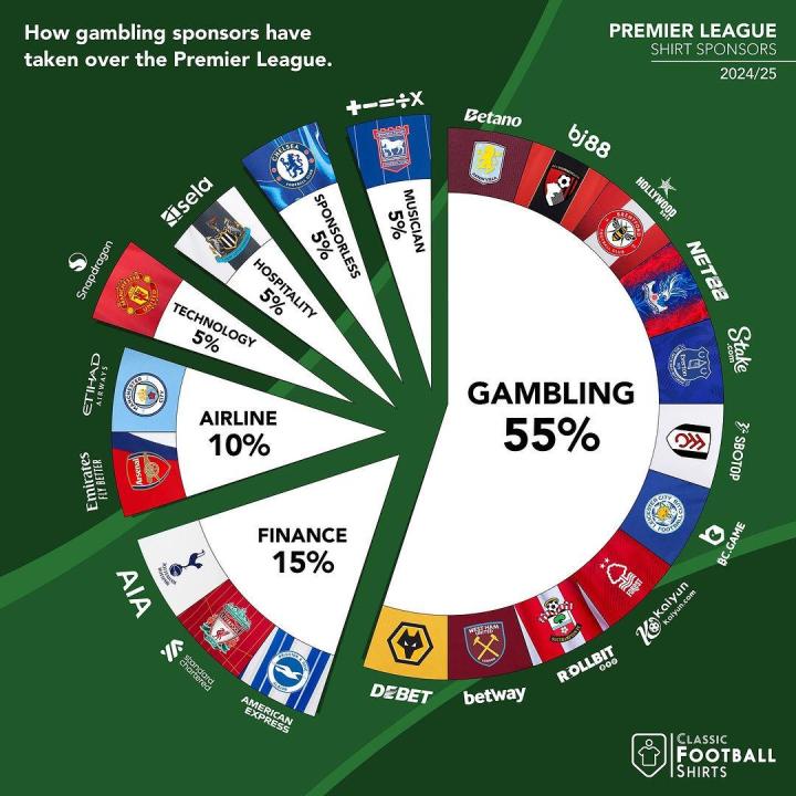 Classicfootballshirts统计出了2024-25赛季英超20家俱乐部球衣胸前广告赞助商的行业分布,其中博彩业占据了半壁江山,他们一共赞助了多达11家俱乐部。