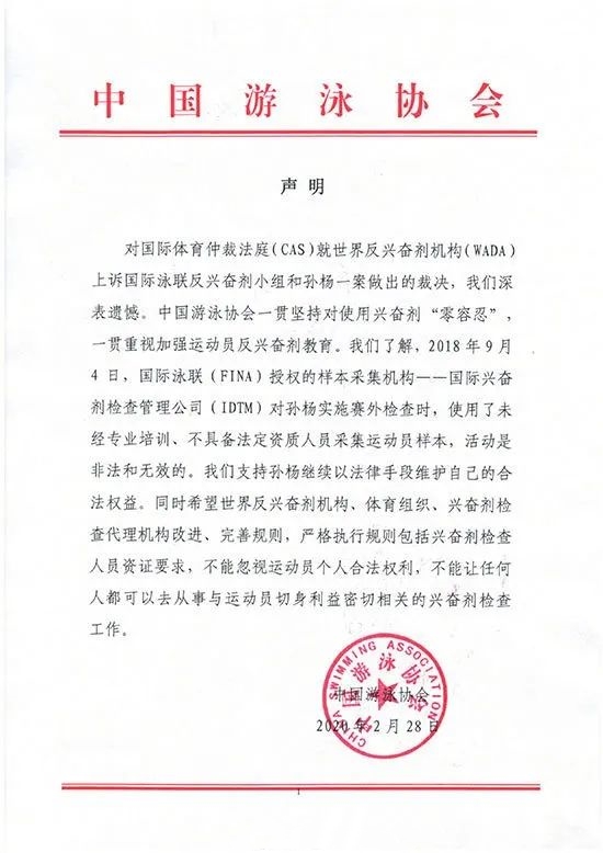 随后,中国泳协发表公开声明,继续力挺孙杨上诉。