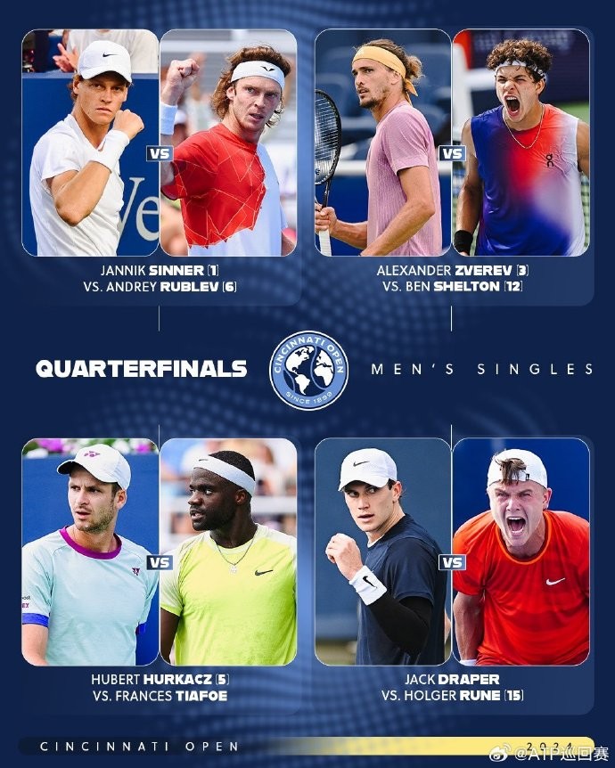 辛辛那提大师赛男单八强:世界第一辛纳将战卢布列夫我的靴子里面有蛇 @懂球帝2024-08-17 13:308月17日,ATP辛辛那提大师赛男单八强对阵,世界第一辛纳将迎战淘汰了张之臻的卢布列夫。男单八强对阵[1]辛纳vs卢布列夫[6][3]兹维列夫vs谢尔顿[12][5]胡尔卡奇vs蒂亚福德雷珀vs鲁内[15]展开更多