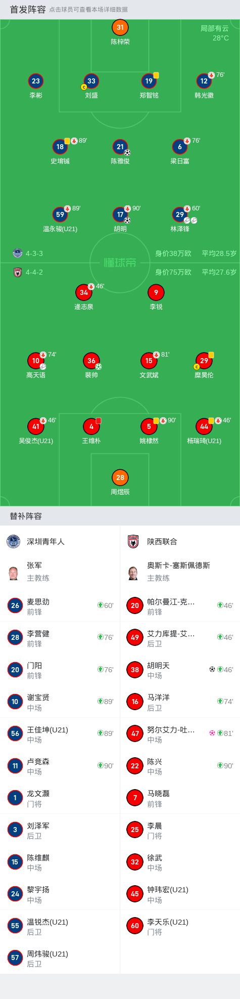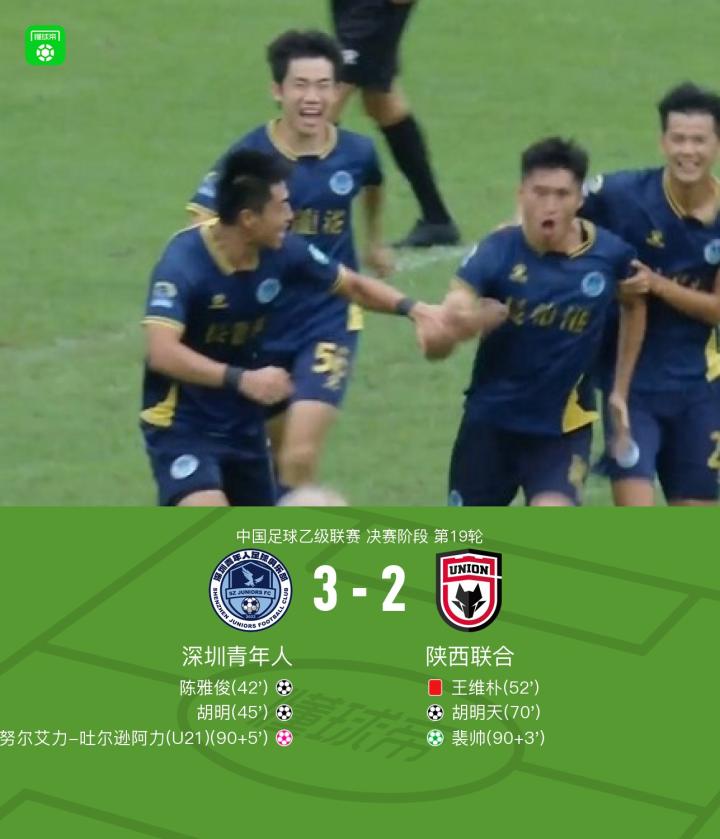 北京时间8月17日,中国足球乙级联赛决赛阶段第19轮,深圳青年人主场迎战陕西联合。上半场陈雅俊轰出一记世界波,随后林泽锋直塞,胡明劲射破门扩大比分。下半场王维朴犯规破坏单刀,裁判先判点球+黄牌,后改判任意球+红牌,之后胡明天劲射破门扳回一球,补时阶段裴帅点射扳平比分,随后李彬破门再度领先。最终,深圳青年人以3-2战胜陕西联合。