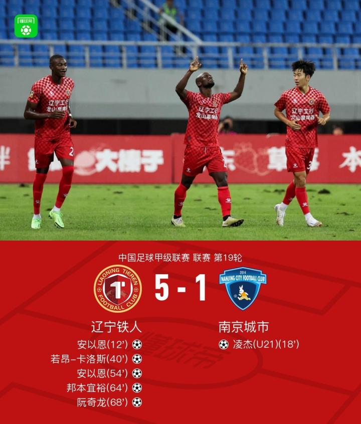北京时间8月17日中国足球甲级联赛第19轮,辽宁铁人主场对阵南京城市。辽宁铁人安以恩梅开二度,若昂-卡洛斯与邦本宜裕均传射,阮奇龙建功;南京城市凌杰破门。最终比分辽宁铁人5-1南京城市。