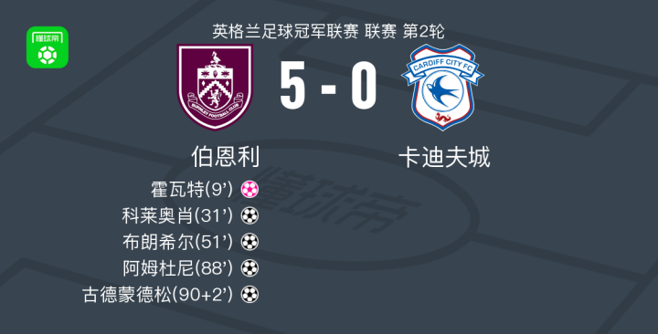 在英格兰足球冠军联赛第2轮的比赛中,伯恩利主场迎战卡迪夫城。比赛一开始,卡迪夫城的霍瓦特不慎自摆乌龙,为伯恩利送上大礼。随后,伯恩利的科莱奥肖再下一城,扩大了领先优势。比赛进入下半场,维蒂尼奥助攻布朗希尔,后者轻松破门得分。接着,阿姆杜尼也贡献了一粒精彩的进球。比赛接近尾声时,马森戈助攻古德蒙德松,后者将比分锁定。最终,伯恩利以5-0大胜卡迪夫城,取得了一场酣畅淋漓的胜利。