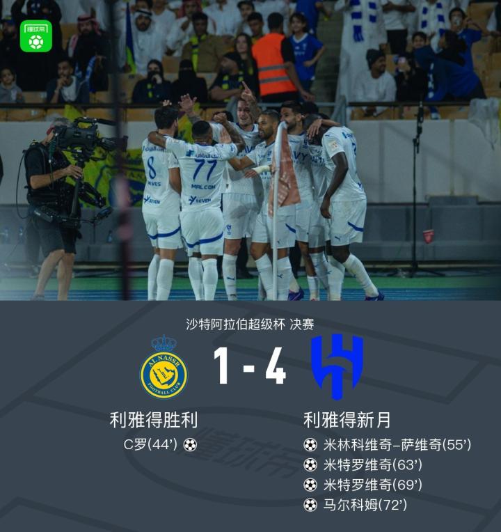 在北京时间8月18日进行的沙特阿拉伯超级杯决赛中,利雅得胜利迎战利雅得新月。比赛中,利雅得胜利的C罗在阿卜杜勒拉赫曼-加里卜的助攻下率先破门。随后,利雅得新月展开反击,米特罗维奇助攻米林科维奇-萨维奇扳平比分。接着,鲁本-内维斯和马尔科姆分别助攻米特罗维奇完成两次进球,马尔科姆抓住本托失误机会也打入一球。最终,利雅得新月以4比1战胜利雅得胜利,夺得冠军。