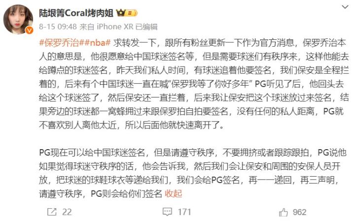 陆垠箐写道:“昨天PG晚上回酒店签了很多球迷,但后面球迷在车库聚集推搡出现安全隐患,喊了几次后无果我不得已把他拉走了,理解球迷喜欢PG,但不知怎么我们包下一层行政楼层后,球迷依然找到了PG的房间,导致PG今早心情全无,这种行为请勿发生 。”