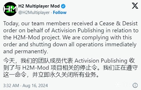 由开发团队“H2M”制作的《使命召唤6:现代战争2重制版》多人MOD原本将于8月16日发布。该Mod将重现第6代《现代战争2》经典的多人模式。其中包括超过50张地图,更新的进度系统,以及原作中没有的新配件和迷彩等。但在宣传片发布后仅五个小时,Mod作者就在推特发布声明,表示该MOD已取消。原因是他们收到了来自发行商动视的禁令,他们选择遵守这个命令,立即永久关闭所有业务。