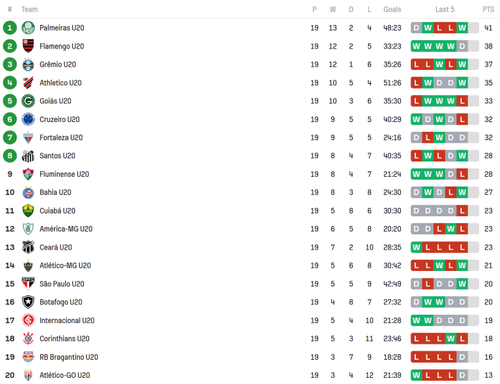 北京时间8月22日,2024赛季巴西U20全国联赛结束了常规赛第19轮(最后1轮)的争夺。