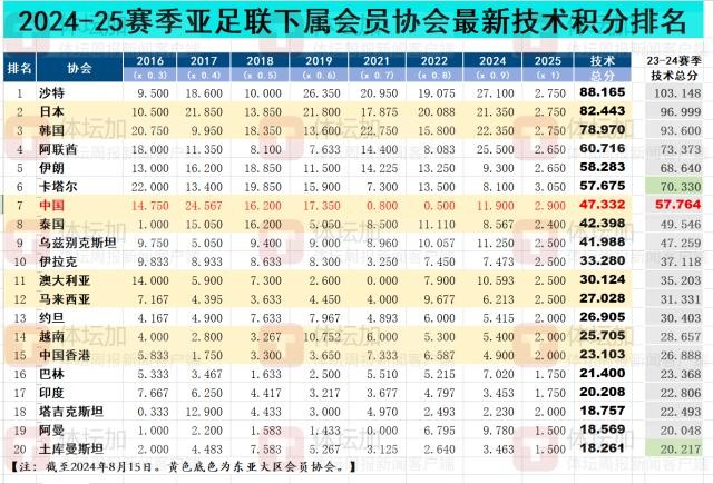 计算出2024-25赛季的最新技术积分后,再加上先前七个赛季(不包括2020赛季)的技术积分,按系数进行换算,也就得出了这个赛季截至目前为止的各会员协会最新技术积分。
