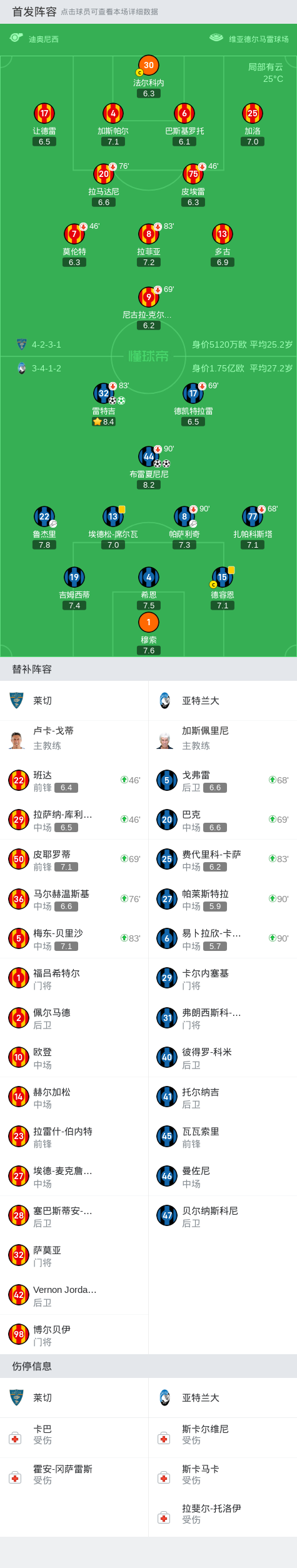 第45分钟,鲁杰里出传中,雷特吉头球破门将比分扩大,亚特兰大2-0