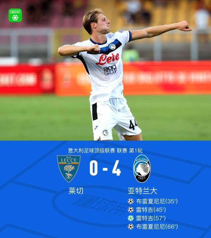 亚特兰大4-0大胜莱切,雷特吉双响,布雷夏尼尼梅开二度
