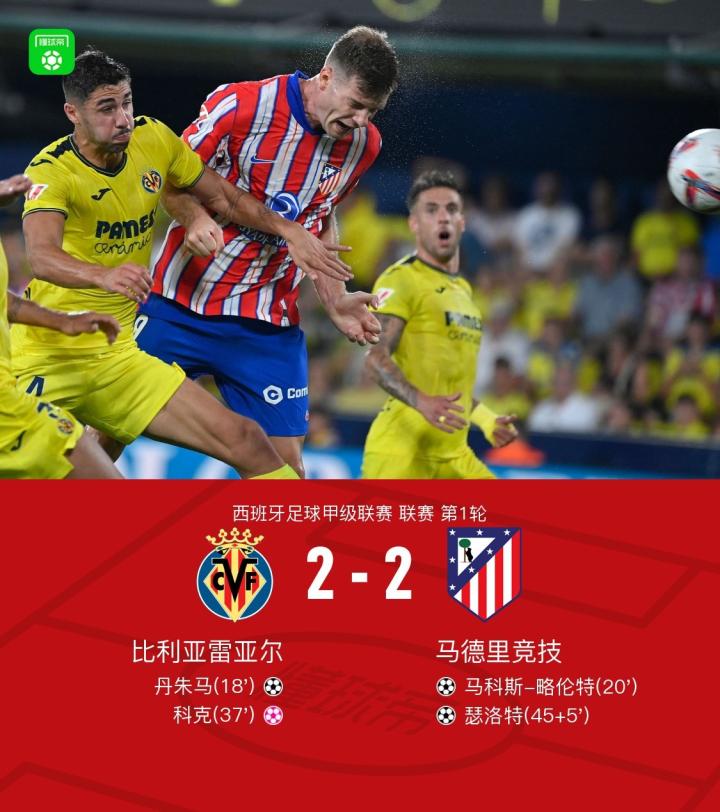 北京时间8月20日,西班牙足球甲级联赛第1轮,比利亚雷亚尔主场迎战马德里竞技。比赛中,雷尼尔多因越位在先,后点包抄破门被吹无效,迭戈-孔德后场长传,丹朱马突破禁区调整低射远角率先完成破门,随后格列兹曼迅速助攻马科斯-略伦特禁区劲射破门将比分扳平,巴埃纳角球机会直接开到门前,科克不慎自摆乌龙,之后巴勃罗-巴里奥斯右路传中,瑟洛特跟进头球破门再度追平比分,全场战罢,最终双方以2-2握手言和。