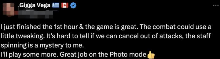 “我刚玩完第一个小时,这个游戏很棒。战斗方面还可以微调一下,取消攻击有点难。我对挥舞棍棒很着迷。我还会继续玩下去的,(游戏内的)拍照模式很棒!”