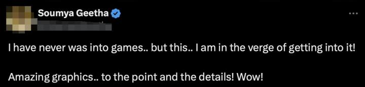 “我从未来没玩过游戏,但是这(游戏),我已经在进游戏了!精美绝伦的图像还有众多细节!”