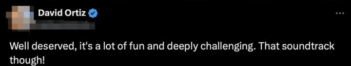 “它(指《黑神话:悟空》)真的当之无愧,它真的很有趣,而且充满了挑战,音乐也很棒!”