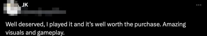 “它(指《黑神话:悟空》)当之无愧,我已经玩过了,这很值得购买。惊人的视觉效果和游戏体验”