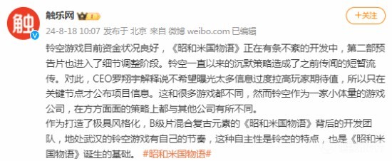 没有解散,《昭和米国物语》有条不紊开发中地心柯耳 @懂球帝2024-08-20 15:45近期,铃空游戏CEO罗翔宇接受了触乐网的采访。他透露《昭和米国物语》正在有条不紊的开发中,第二部预告片也进入了细节调整阶段。采访中提到,铃空游戏一直以来的沉默策略造成了之前“解散传闻”的短暂流传。对此,罗翔宇解释说不希望曝光太多信息过度拉高玩家期待值,所以只在关键节点才公布项目信息。《昭和米国物语》曾于2022年1月曝光了第一支官方正式预告片,该游戏以其极具风格化的B级片复古元素一度引起玩家们的热议。展开更多