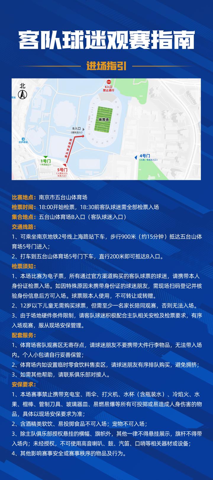 一、客队球迷观赛需从指定通道统一入场,且无法从其他入场通道前往客队球迷区域,请客队球迷于8月21日17:30在五台山体育场B通道集合准备入场,18:00开始入场,18:30将关闭客队球迷入场通道,本场比赛没有纸质票,需凭本人身份证检票入场,特此提醒(具体入场事宜及限带物品清单详见附图);
