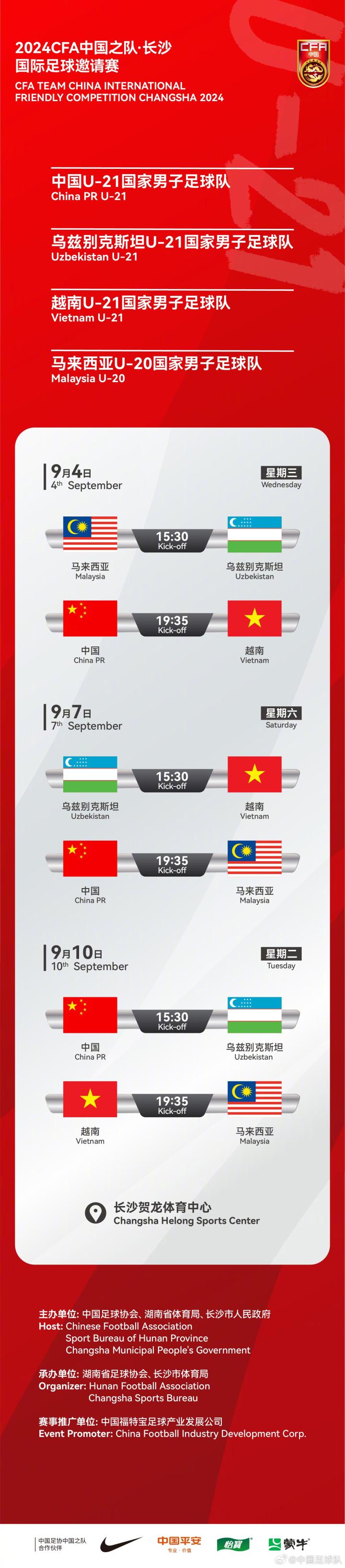 参赛球队:中国U-21男足、乌兹别克斯坦U-21男足、越南U-21男足、马来西亚U-20男足