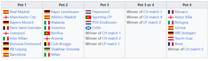 第四档:摩纳哥(24),阿斯顿维拉(20.86),博洛尼亚(18.056),赫罗纳(17.897),斯图加特(17.324),格拉茨风暴(14.5),布雷斯特(13.366),冠军路径比赛5的胜者(马尔默/斯巴达布拉格,18.5/22.5)