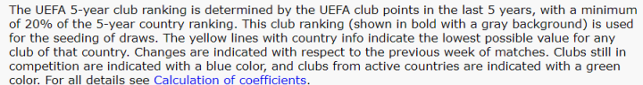 根据欧足联的规定,欧足联5年俱乐部排名是根据过去5年内的欧足联俱乐部积分确定的,最低占本协会5年国家排名的20%。过去5年,英格兰的欧战积分为104.303分;所以阿斯顿维拉在抽签时的欧战积分记为20.86分(仅此而已)。