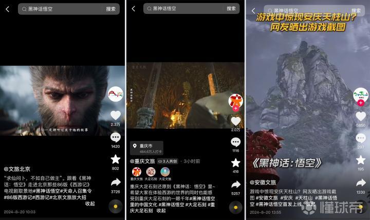 早在去年8月20日,山西省文旅厅的bilibili官方账号就发布了一则关于山西古建的宣传视频,其中展示了《黑神话:悟空》的实际取景地古寺、古塔的场景对比。据古建筑爱好者不完全统计,视频中出现的至少有忻州五台山的佛光寺、南禅寺、金阁寺;晋城的青莲寺、陵川西溪二仙庙、泽州玉皇庙。截至2024年8月19日,该视频已有168.9万的浏览量。在今年7月发布的宣传视频里,山西文旅厅则将游戏场景和实地风光相结合,集中展示了当地代表性的旅游胜地,观众们跟随主人公孙悟空,沿途饱览山河美景。