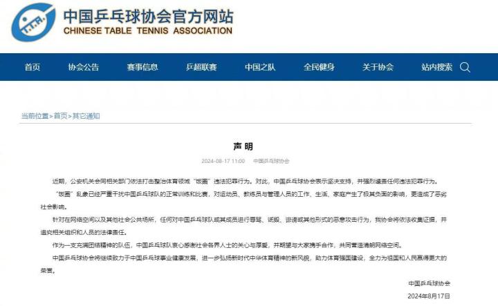 公安机关连续发布打击整治体育领域“饭圈”违法犯罪行为的公告,中国乒协表示了坚决支持,并强烈谴责违法犯罪行为,并称“饭圈”乱象已经严重干扰球队的正常训练和比赛。然后,这条公告又遭到了“饭圈”的攻击。