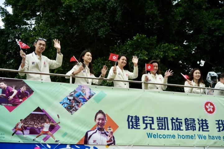 出席的运动员包括女子重剑夺金的江旻憓,游泳项目夺得两枚铜牌的何诗蓓,以及多名港队代表,港协塈奥委会会长霍震霆也参加了这次巴士巡游。
