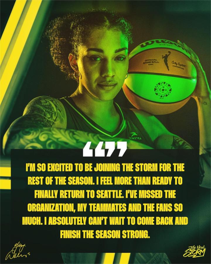 加比:“我非常兴奋能够加入西雅图风暴,完成本赛季剩余比赛。我已经准备好重返球队了。我非常想念这支球队以及我的队友和球迷们。我等不及回归并打出强势表现了。”