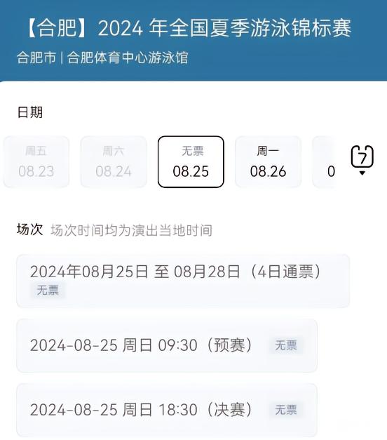 目前,全国夏季游泳锦标赛8月25日的门票已在大麦网售罄,预赛门票30元,决赛门票60元。